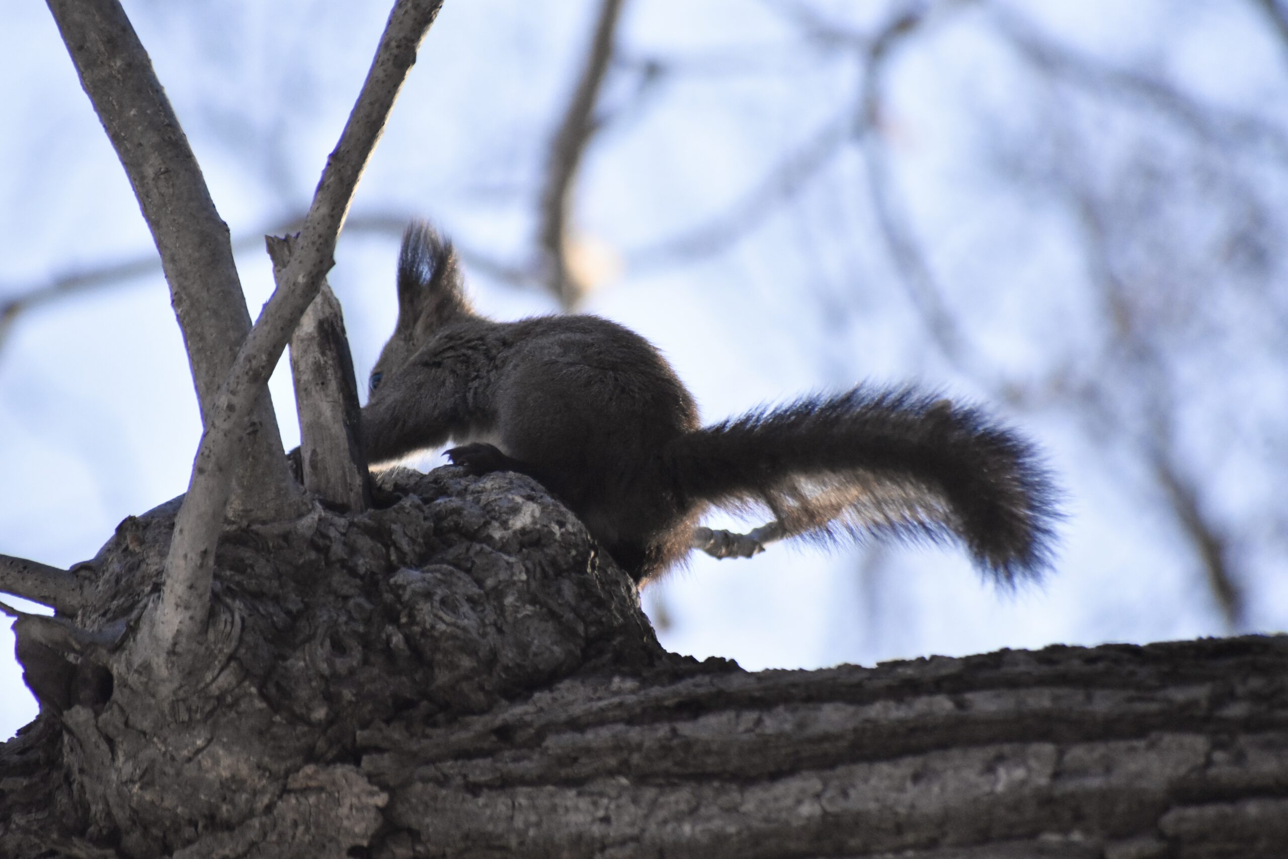 光と影のコントラストの中で、リスの顔はシルエットのように暗くなり、表情までははっきりと見えません。
