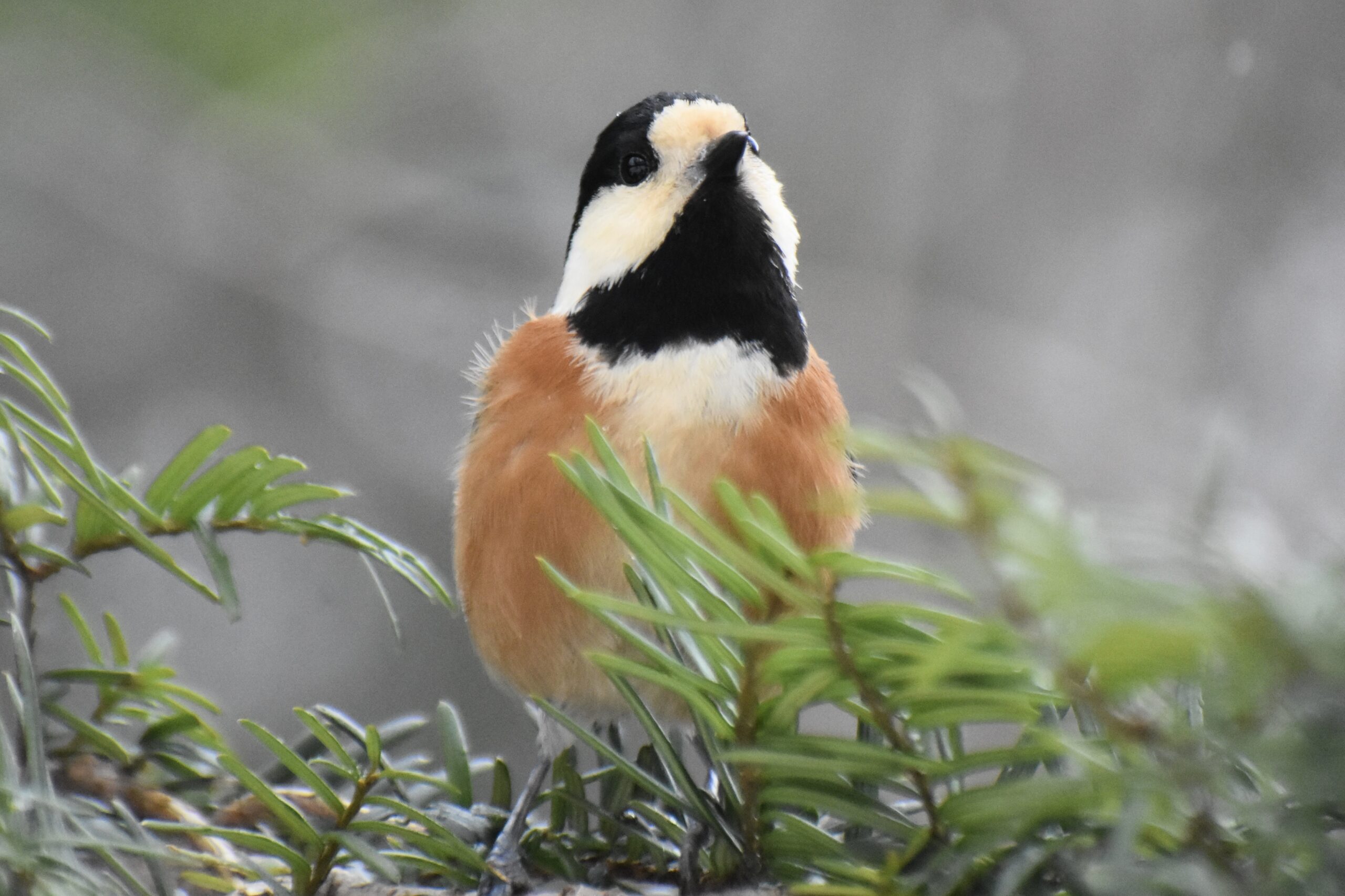 カメラを構えるとヤマガラがふと顔を上げ、こちらをじっと見つめてくれたんです。